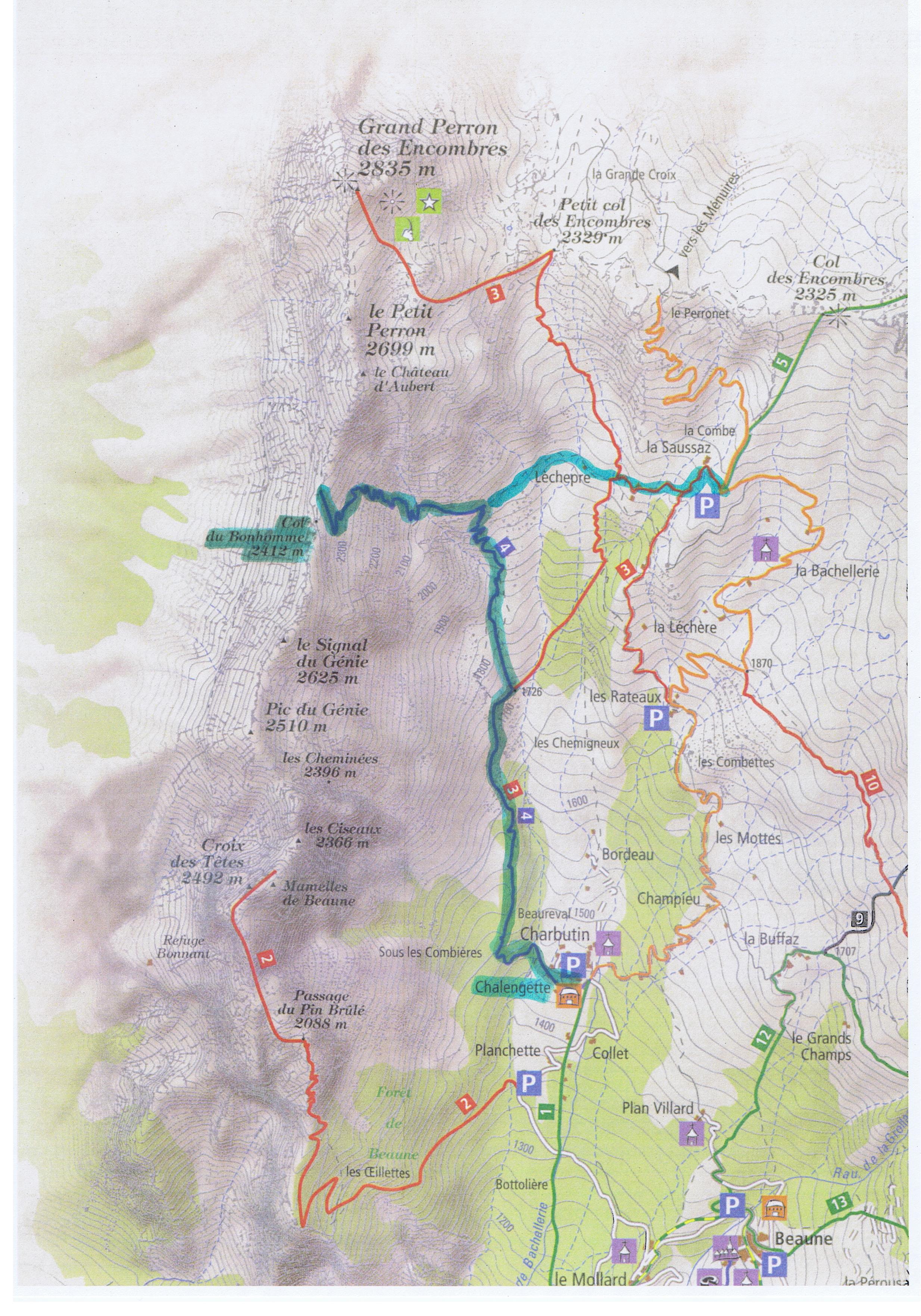 Emprunter le chemin en terre qui part à plat en direction du torrent et du massif montagneux. Traverser à Gué le « Saint Benoît ». Prendre alors un petit sentier qui traverse la forêt en rive droite du torrent puis monte en pente plus soutenue. Vous retraverserez le ruisseau au fond du ravin de la « Besse » avant de serpenter dans les pentes de « Clappier » jusqu'à la bifurcation Col du Bonhomme (à gauche), Grand Perron (à droite).
